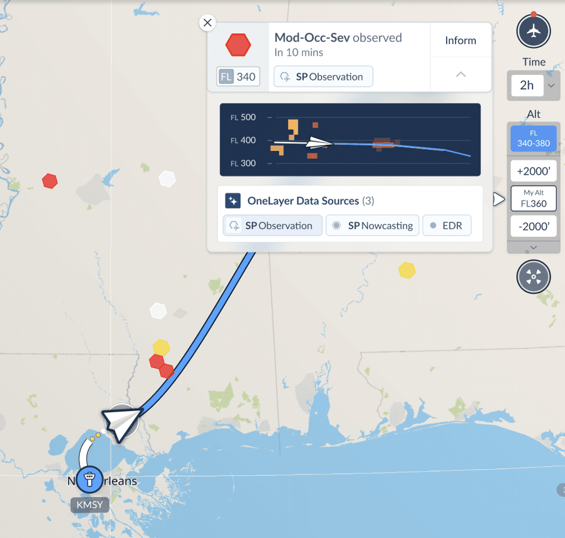 SkyPath OneLayer uses the familiar SkyPath hexagon display and severity scale, integrating data from: